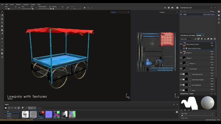 Our pipeline is pretty straightforward. We use Blender to make our 3D models. Substance is our go-to texturing software and the game is made in Unity. Based on the assets, we make a high-poly version and a low-poly version. We then prepare the model for Substance Painter. We UV unwrap the model, rig, and weight paint if needed. We then generate maps using the high-poly model in Substance Painter. After that, we apply these generated maps onto the low-poly mesh and we start painting on the models. We often use standard Smart Materials, but we create new materials whenever we need to – in the asset shown below, we used generators and grunge maps to create dirt in the corners. After we do this, we export the textures to the target game engine and assemble the asset there.