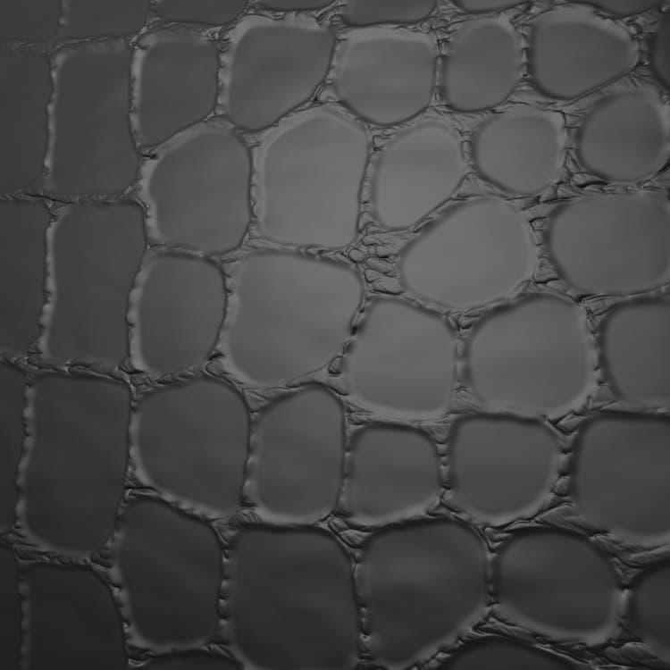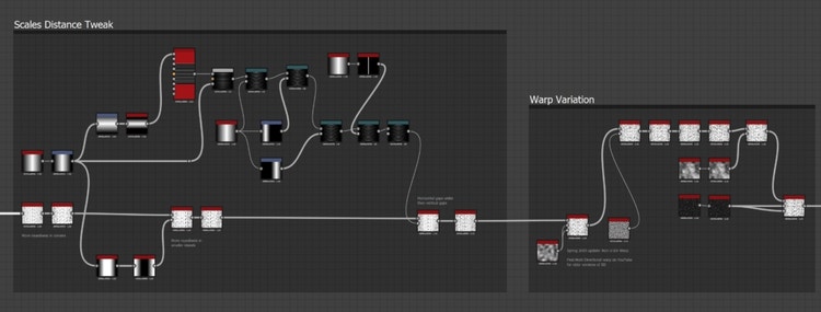 Later on, I process this map through a sequence of blurs and histogram scans to increase the variation in the distance between the scales. Then I use various warps from the Spring 2019 update to create stretched and distorted, organic look.