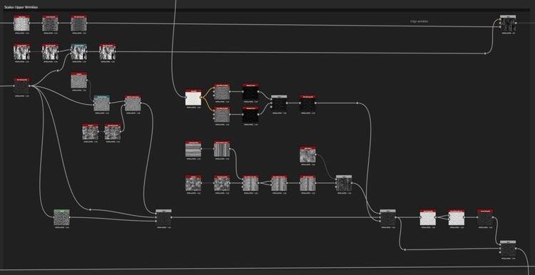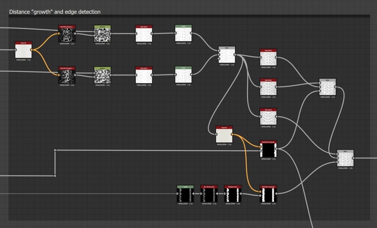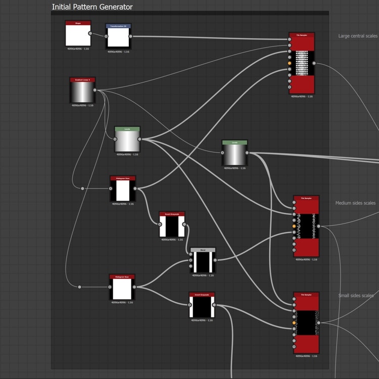 After this step, I “grow” a more natural pattern with the Distance node, to create more organic shapes of the scales than in my initial pattern. Then I use several Edge Detect nodes to blend them together and create more variation in scale roundness.