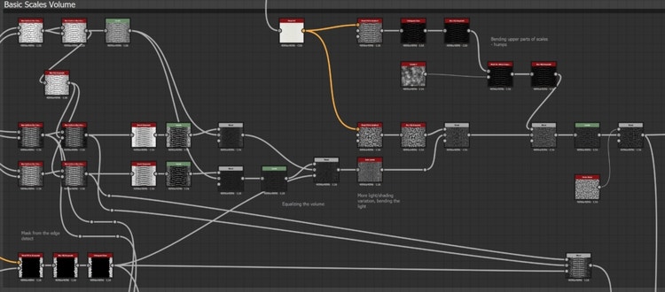 And then I use this map as an opacity map when blending my basic scales volume with modified Crystals and Anisotropic noise.