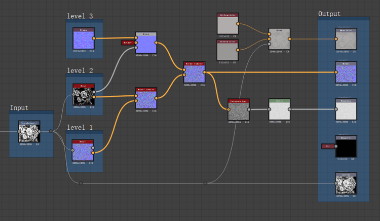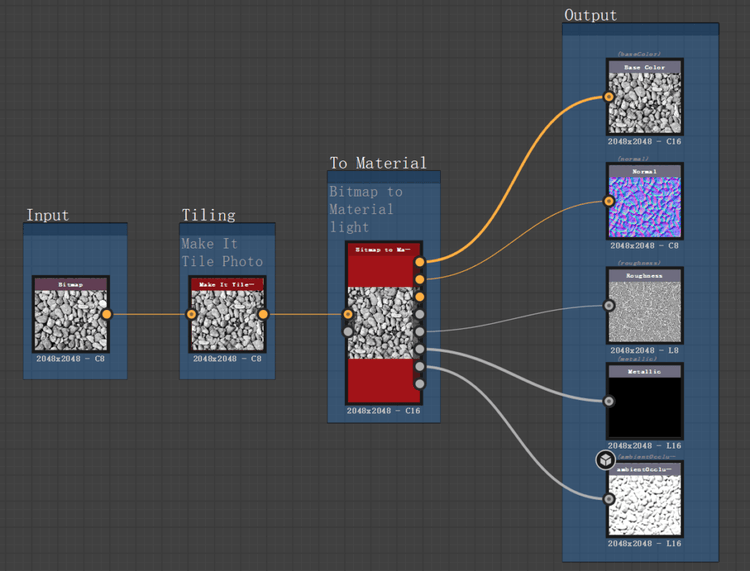 In addition, Substance Designer also provides a series of nodes to process scanned textures to PBR materials, which can be used for multi-angle light scanning or just single photos. We can select the correct nodes pipeline according to the different texture requirements. This method is very practical, and we also used it for the current project.