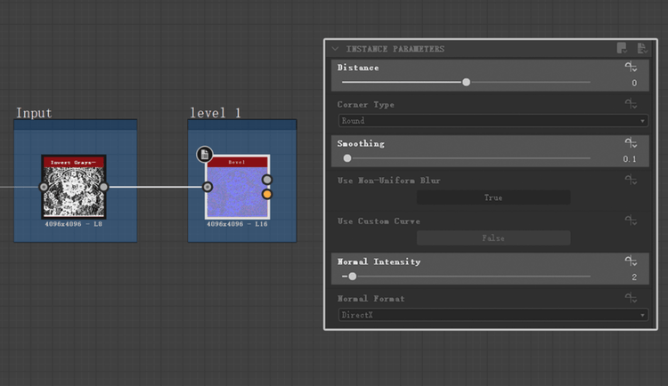 Then I can use the Bevel node to get my Normal, through Distance, Smoothing, Normal Intensity parameters to adjust the Normal’s bump information.