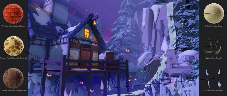 Whether materials or atlases, all our stylized assets remain Substance materials – that is, each one is completely parametric. Each parameter can produce an inexhaustible wellspring of variation; this tremendous flexibility is invaluable when bringing diversity to otherwise homogenous surfaces.