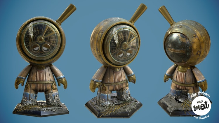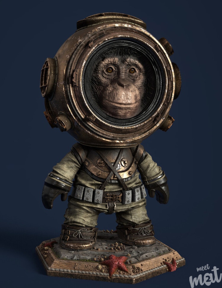 After changing gears, I went with a face that gave me more flexibility. I had some early costume designs for a space monkey, but after seeing some vintage deep-sea diving suits I decided to switch to a sea monkey. The head design worked well, there was a good mix of material types, and I liked the option to layer in some heavy patina.