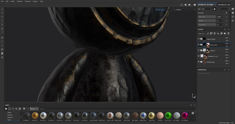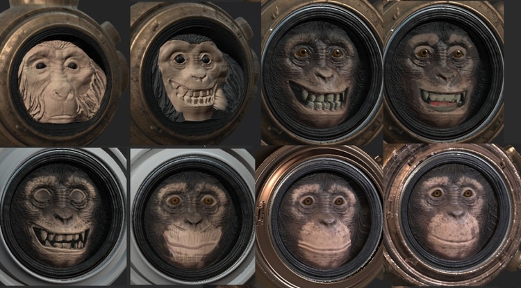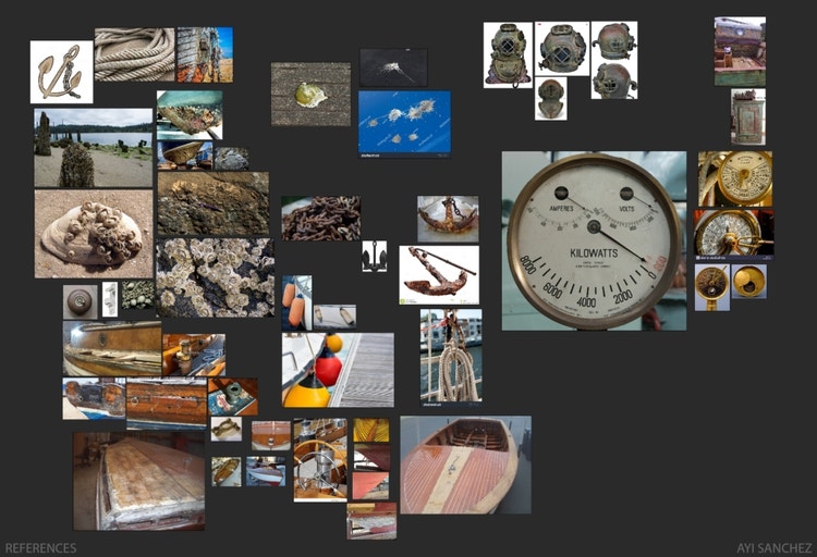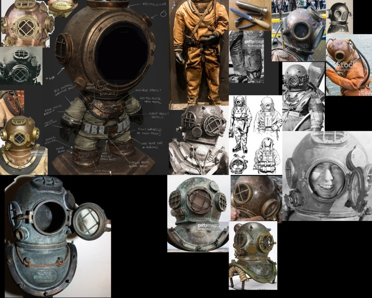 Vintage deep-sea diving suits have a decent mix of materials types (brass, leathers, textile, rubber), so I wanted to make sure my final design included these, to have a nice range of color blocking and specular values. And since Substance Painter makes it easy to add wear to materials, I opted for a well-used diving suit. This would help break up some of the larger surfaces, like the brass helmet.
