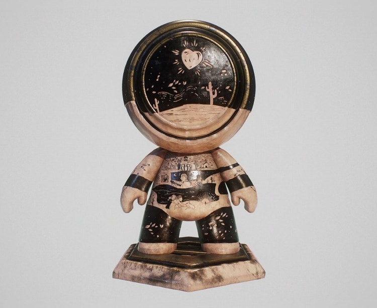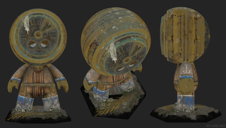 In terms of art direction, I wanted to use a maximum of two colors for the palette, but some more came in towards the end. The idea was mainly to use brownish tones and complementary blues. I used those for the body. As part of the face, black paint felt quite natural with some contrasting white elements. That done, my main goal was to do as much as possible with the different hue inside each tone; wood, for example, needed to feel rich in nuance and subtleties, but everything also needed to feel fairly homogeneous. So I used weathering as a visual glue.