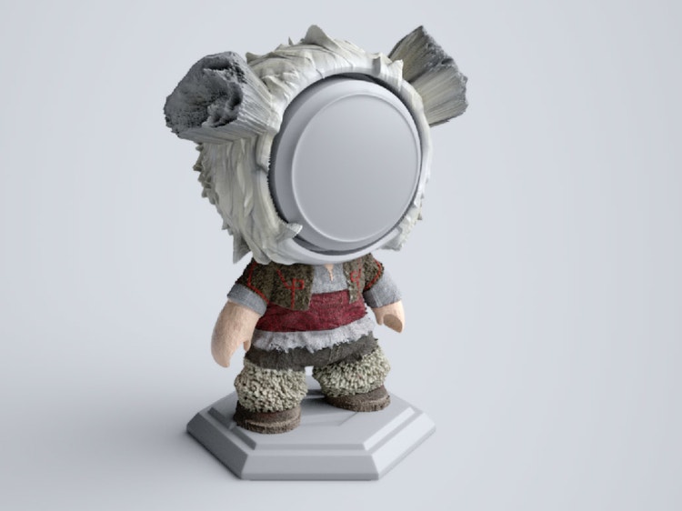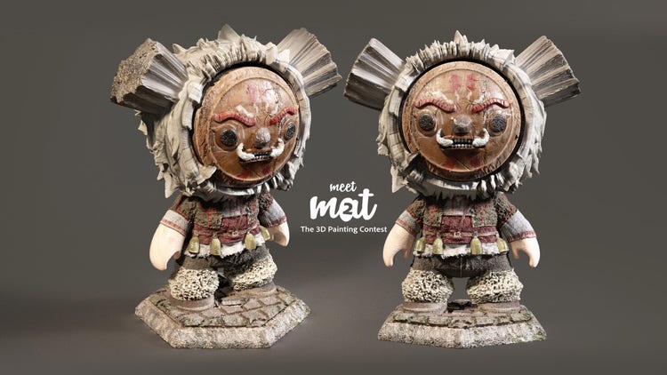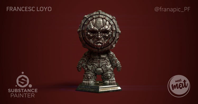For my Meet MAT 2 entry, my main goal was to incorporate the circle shape on the front of the head, as this was such an iconic part of the MeetMat mesh. I’d originally wanted to create a little kid in a lion costume. But I was creating the displacement within Painter exclusively, with brush strokes and modifiers, and I wasn’t happy with the results I was getting for the kid’s face. The kid was looking more creepy than cute.