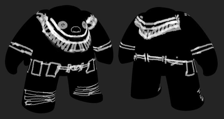 I started the project by laying down some simple line art on the model, which basically acted as a concept. This would serve as my guide for my material breakup, which would generally also define my main areas of displacement.