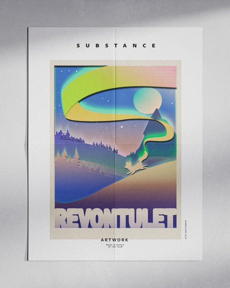 3D artists of the team use the content to create the artwork on the communication release. The aim of this project was to only use the graphic design materials available on Substance 3D Assets. We came up with an idea of a simple layout with graphic materials and models which opened possibilities to use a wide range of visuals and explore creative ways to highlight the scene.