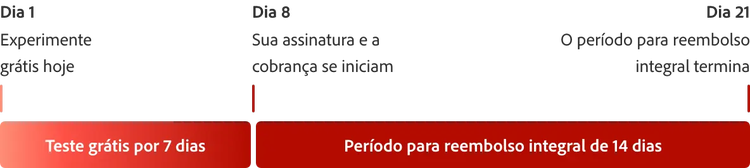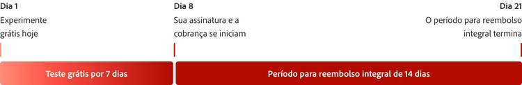 Teste grátis por 7 dias o Acrobat Pro. Se precisar de mais tempo para experimentar todos os recursos, você terá mais 14 dias para solicitar o cancelamento e receber o reembolso integral.
