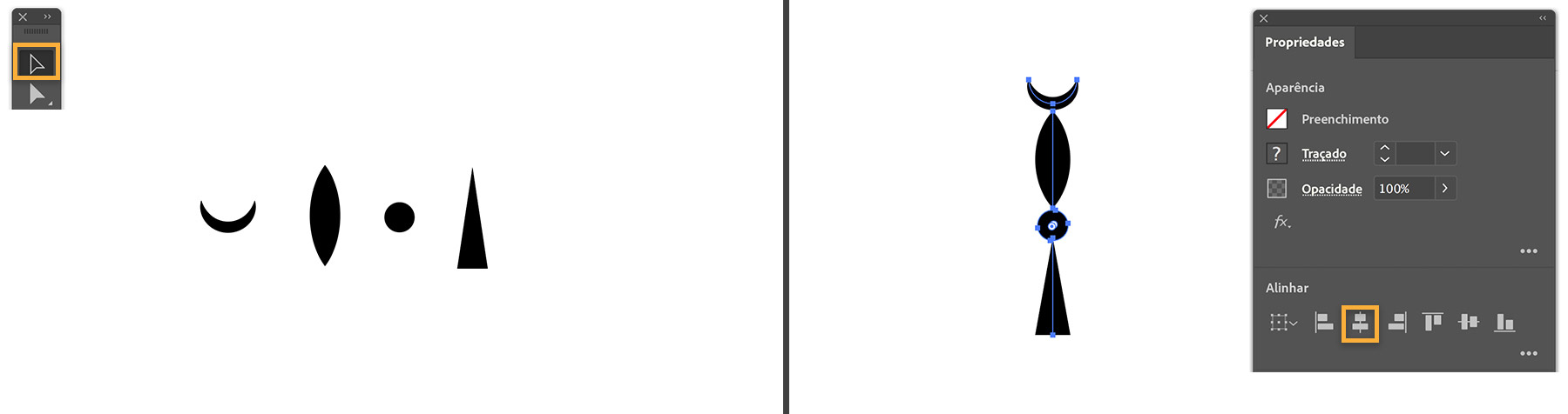 Baixe nossa arte de exemplo para acompanhar ou crie suas próprias formas. Use a ferramenta Seleção para arrastar e empilhar as formas. Depois, selecione todas as formas e clique em Alinhamento horizontal centralizado no painel Propriedades.