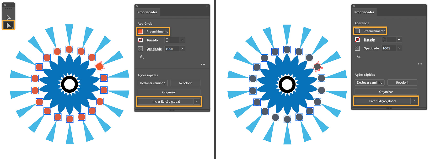 É fácil editar sua mandala depois de terminá-la. Use a ferramenta Seleção direta para selecionar o objeto que deseja alterar e clique em Começar edição global no painel Propriedades. Você pode alterar a cor de preenchimento, o traçado, a opacidade ou outros atributos. Todas as instâncias da forma são editadas ao mesmo tempo. Clique em Parar edição global quando terminar de fazer alterações.