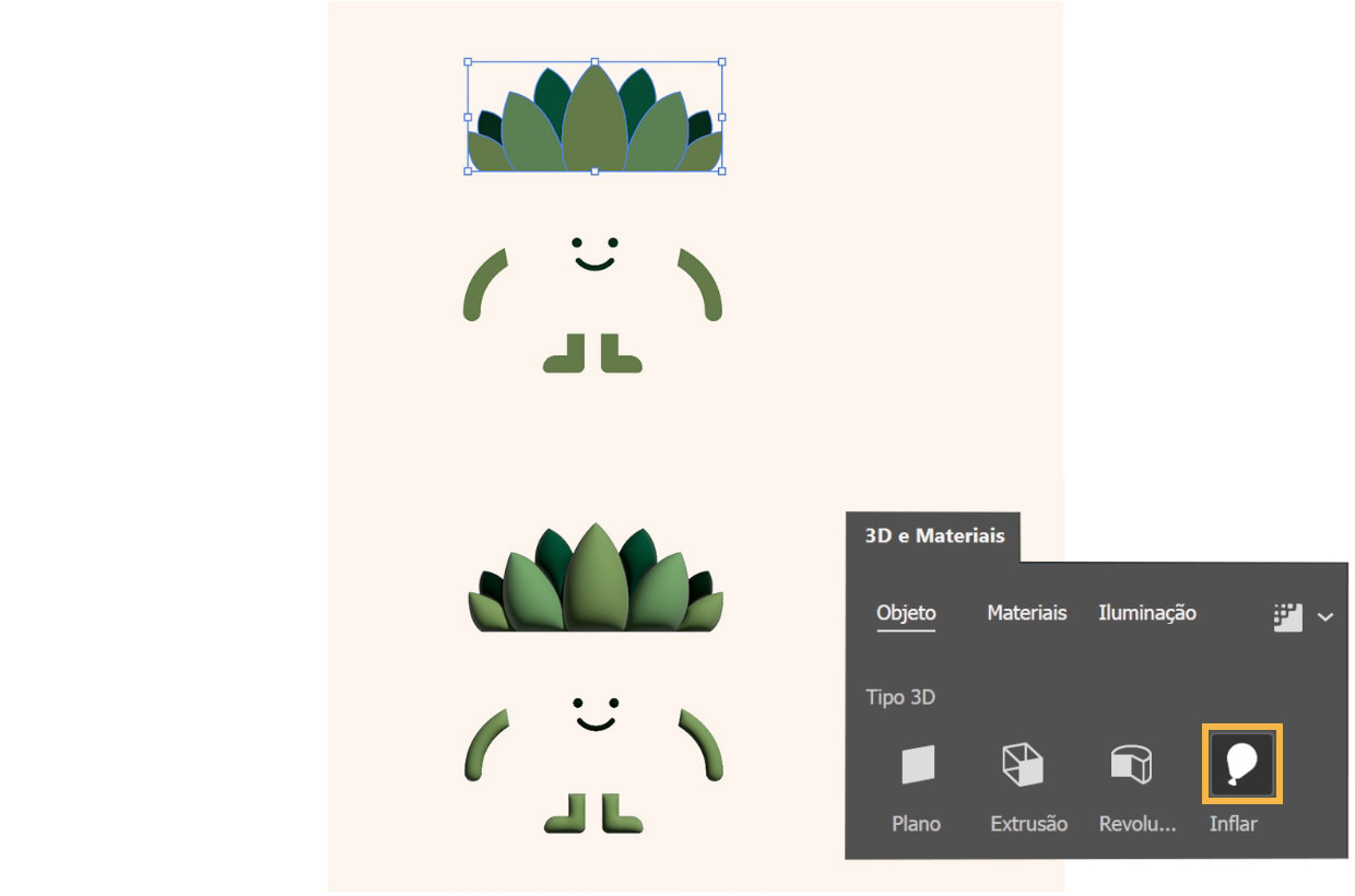 Arraste sobre as folhas com a ferramenta Seleção e escolha Objeto > Agrupar. Depois, selecione todas as partes do mascote de planta e escolha Efeito > 3D e materiais > Inflar.
