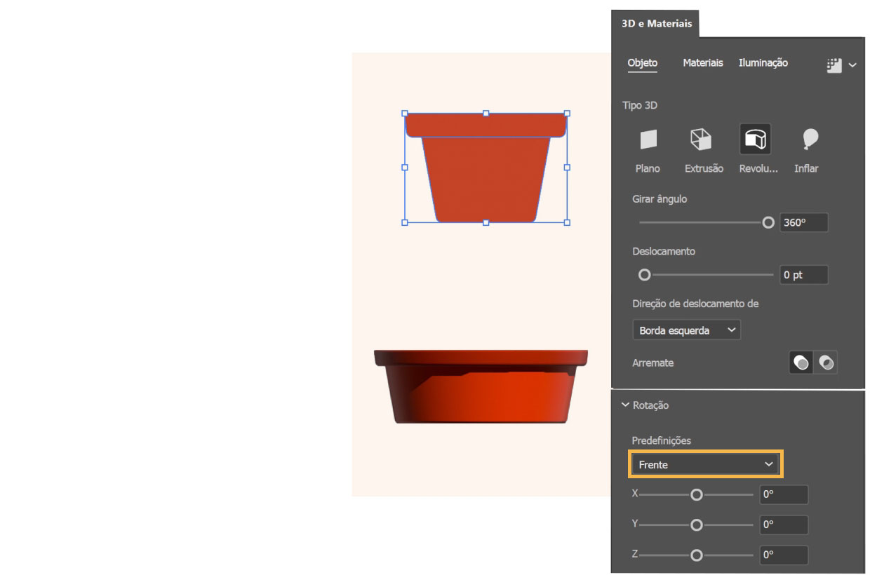 Com a ferramenta Seleção, arraste sobre o vaso para selecioná-lo. Passe para a guia Objeto e clique em Revolução. Ajuste as configurações para girar o objeto da maneira que deseja.