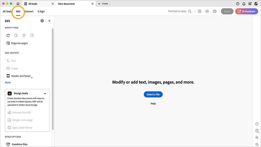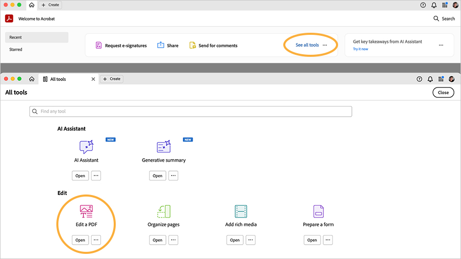 From the Acrobat Home screen, click the Edit a PDF tool near the top. If you don’t see this, click the See all tools link to display the All tools tab, and select Edit a PDF . If you are in a new document view, or you have already opened the document you want to edit, you can find Edit a PDF in the Tools panel on the left.