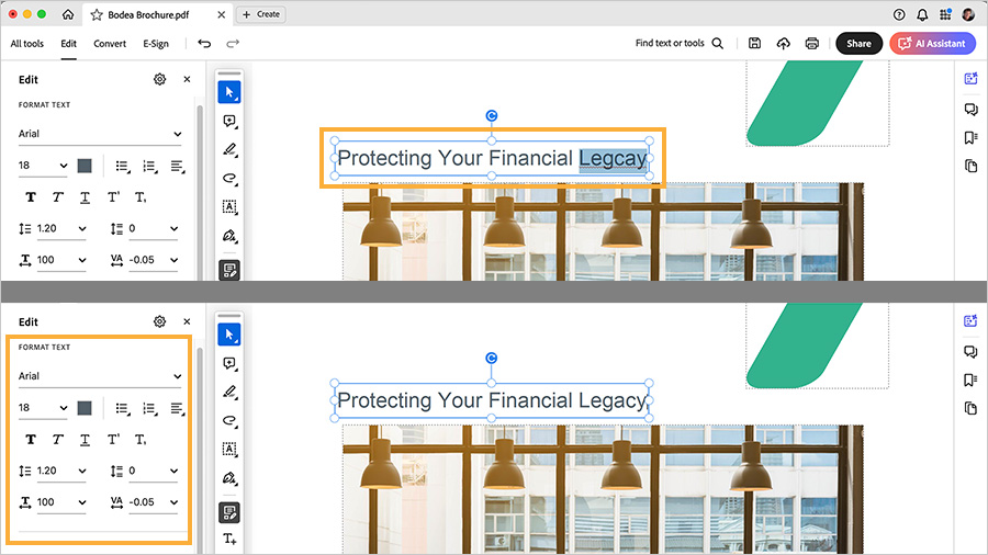 Click in a text box to edit the text with the built-in PDF editor. In the Bodea Brochure.pdf sample file, there is a typo in the first text box above the image. Click in the text box and then highlight the “Legcay” typo and correct it by typing “Legacy”. You can also use options in the Format section in the left panel to customize text. Learn more aboutediting text in PDFs .
