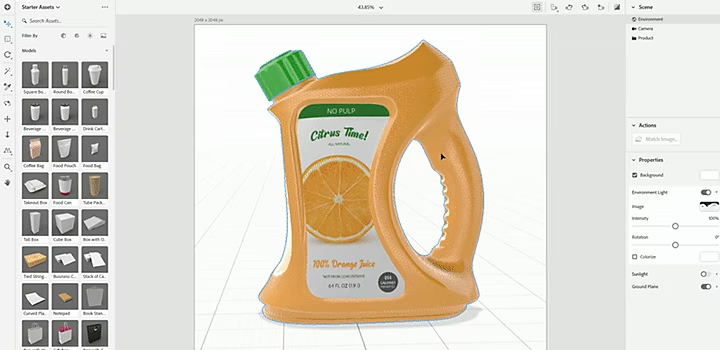 c) Aranjați obiectele în scenă, amplasându-le unde doriți. Experimentați cu diferite unghiuri ale camerei, ajustați luminile și materialele pentru a găsi aranjamentul perfect pentru scenă și adăugați un fundal la scena dvs. Alegeți o imagine de fundal din panoul Materiale de început sau Adobe Stock sau importați-vă propria imagine. Utilizați Potrivire imagine pentru a crea automat o iluminare realistă pe baza imaginii de fundal sau ajustați pe cont propriu setările pentru Lumina de mediu și Lumina solară.