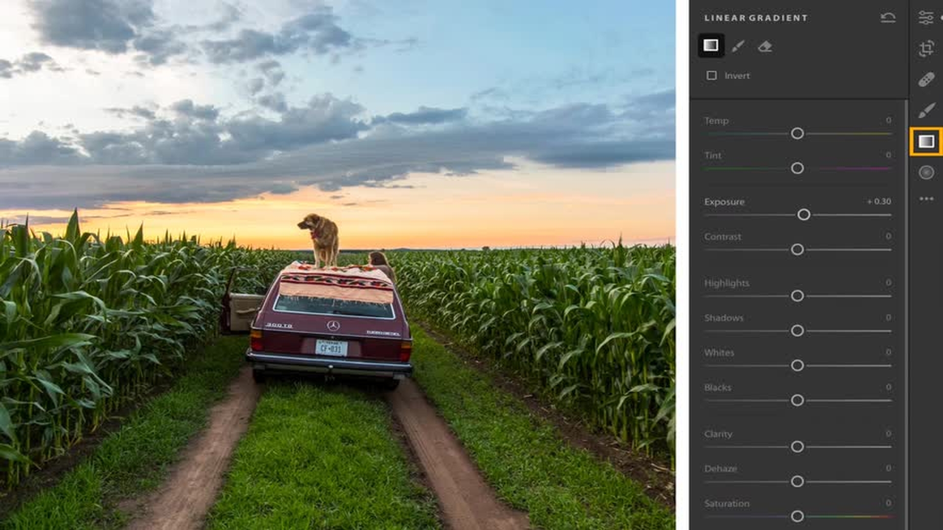 You can modify parts of an image using selective edits. For example, you may want to enhance the colors of a dull sky. To apply a selective edit, choose one of the selective edit tools, such as the Linear Gradient.