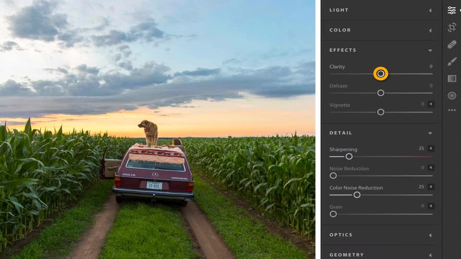 Adjust settings such as Clarity and Dehaze in the Effects section to enhance the details of your image. Then, use the Sharpening slider in the Detail section to fine-tune it more.