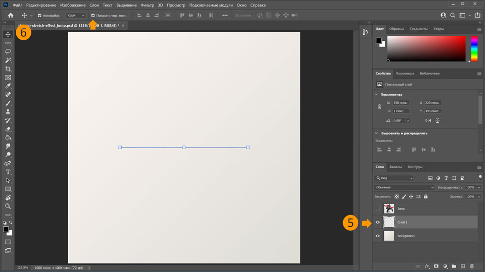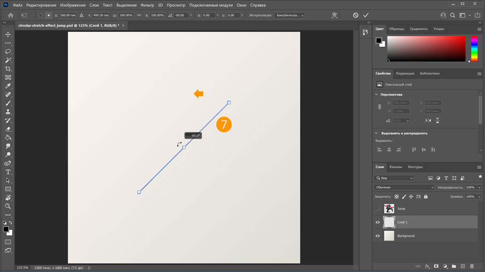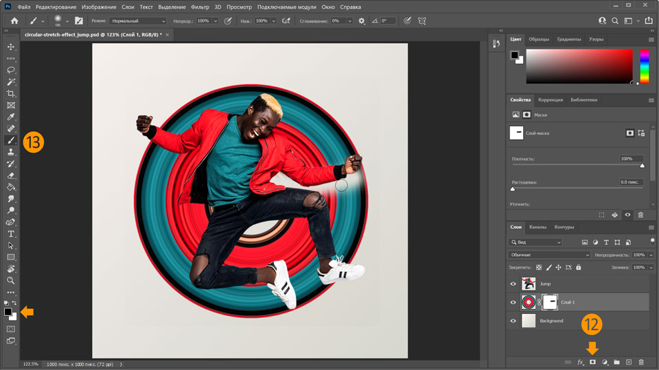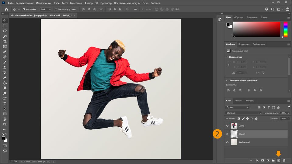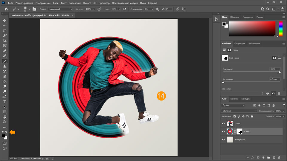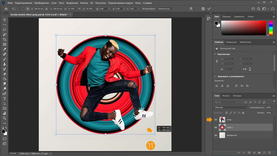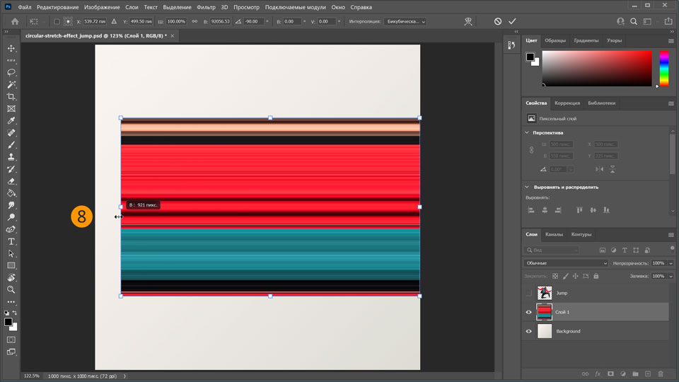 11. Снова сделайте слой Jump видимым и отрегулируйте размер кругового эффекта растягивания за ним, удерживая нажатой клавишу Alt и перетаскивая маркер.