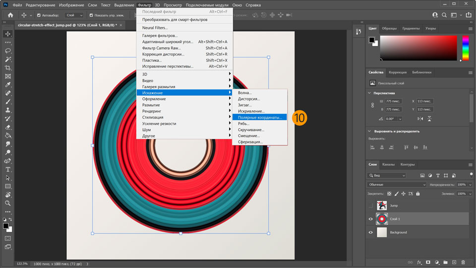 10. В главном меню выберите Фильтр > Искажение > Полярные координаты, чтобы преобразовать горизонтальный эффект растягивания в круговой.
