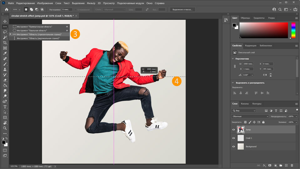 3. Выберите слой Jump, затем нажмите на инструмент Прямоугольная область и, удерживая нажатой кнопку мыши, выберите в контекстном меню инструмент Область (горизонтальная строка).