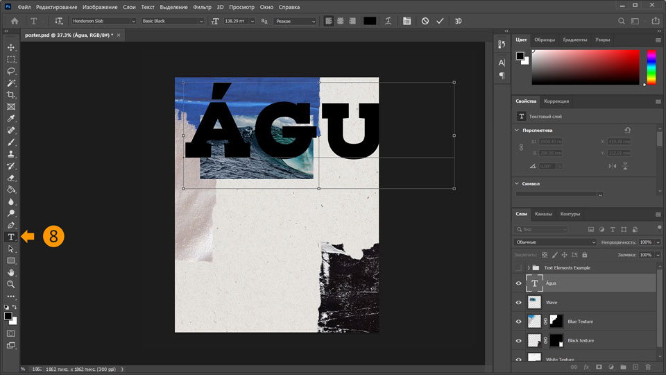 8. Теперь добавьте к своей композиции текст. Выберите инструмент Текст (T), затем выберите понравившийся шрифт. Араужо использовал Henderson Slab из Adobe Fonts. Установите размер шрифта 550 пикселей и введите слово ÁGUA.
