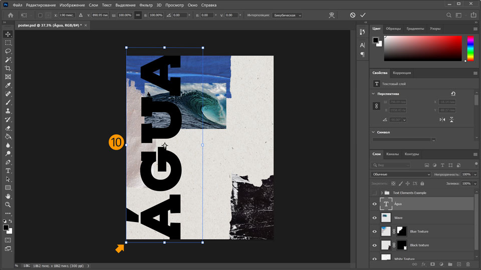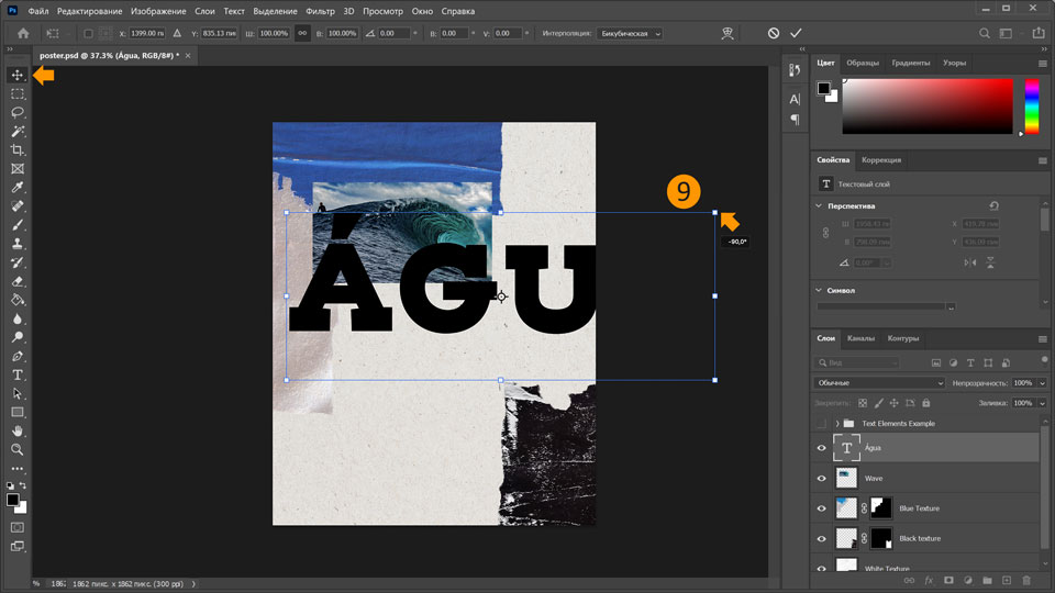 9. Нажмите на инструмент Перемещение (V) и переместите текст в середину плаката. Затем установите указатель мыши рядом с верхним правым углом текстового блока так, чтобы он превратился в концентрическую двустороннюю стрелку. Теперь, удерживая клавишу Shift, поверните текст на 90 градусов.