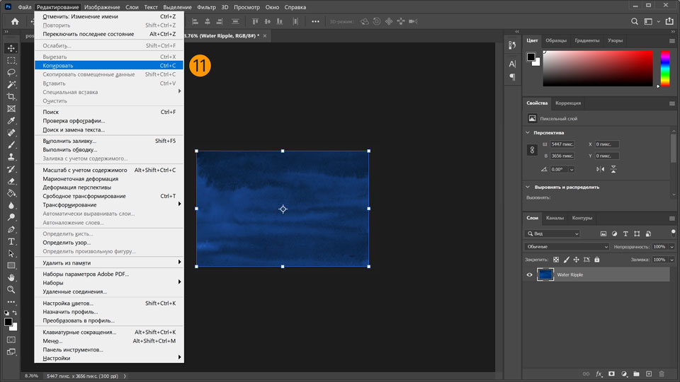 11. Затем откройте файл water ripple.psd и выберите Редактирование > Копировать.