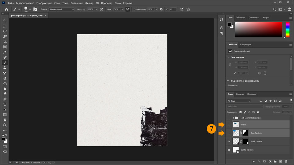 7. Выберите слой Blue Texture, затем нажмите на квадрат рядом с миниатюрой слоя, чтобы сделать слой видимым. Сделайте то же самое со слоем Wave (появится значок глаза, указывающий на то, что слой видимый).