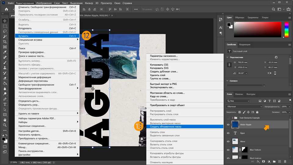 13. Правой кнопкой мыши нажмите на слой Water Ripple и выберите Создать обтравочную маску, чтобы добавить к тексту эффект ряби.