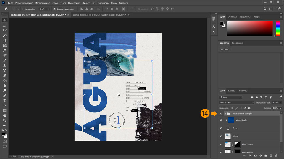 14. Добавьте к своей композиции текст и поэкспериментируйте с размером, интерлиньяжем, размещением и другими декоративными эффектами. Взгляните на следующий пример: нажмите на квадрат рядом со стрелкой и значком папки Text Elements Example (Пример элементов текста), чтобы сделать группу видимой.