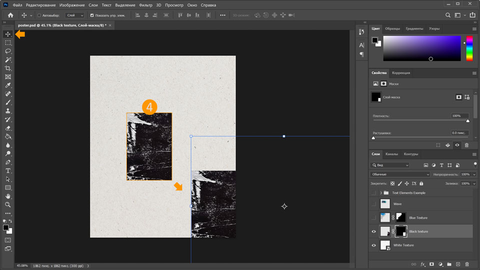 4. Выберите инструмент Перемещение (V) и переместите прямоугольник черный текстуры в нижний правый угол.