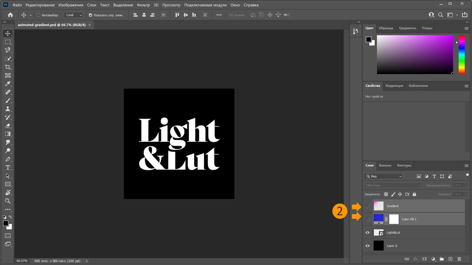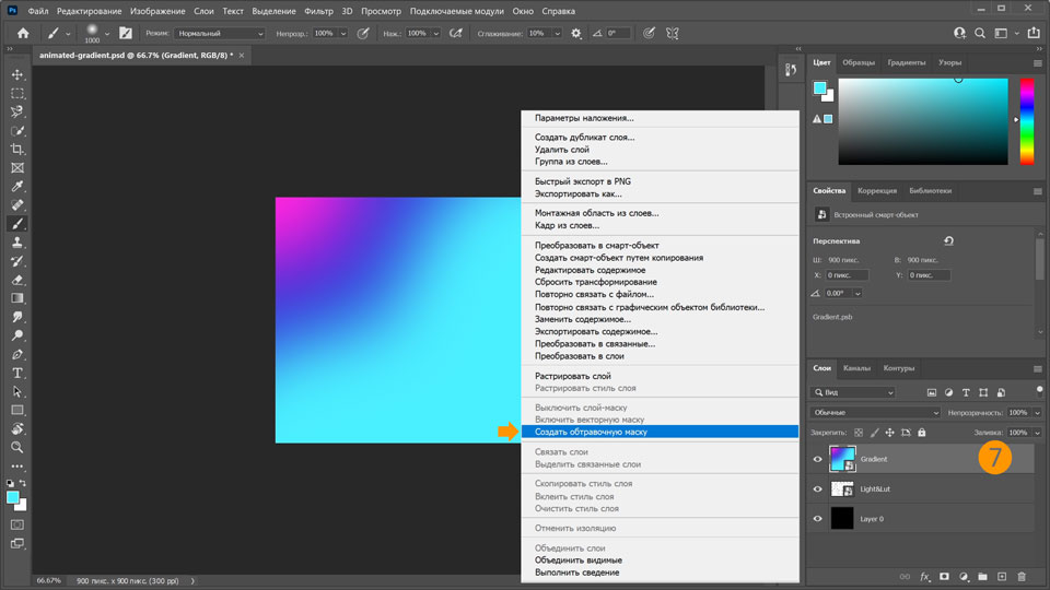 7. Нажмите правой кнопкой мыши на слой градиента и выберите Создать обтравочную маску, чтобы привязать градиент к тексту. Теперь градиент находится на надписи Light&Lut.