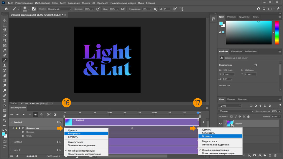 16. Теперь нажмите правой кнопкой мыши на первый ключевой кадр и выберите Копировать.
