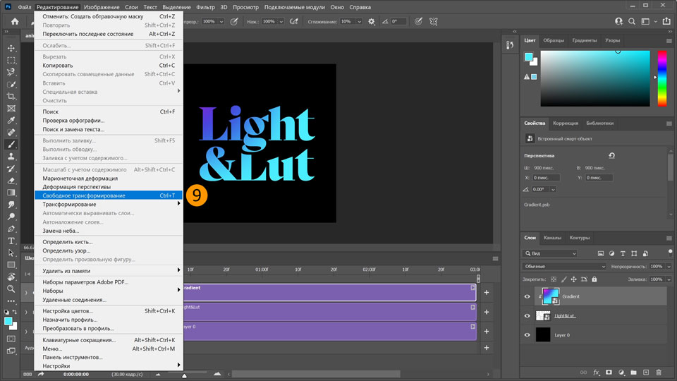 9. Выделив слой градиента, выберите Редактирование > Свободное трансформирование, чтобы открыть окно Свободное трансформирование. Можно также использовать клавиши Control+T (Windows) или Command+T (macOS).