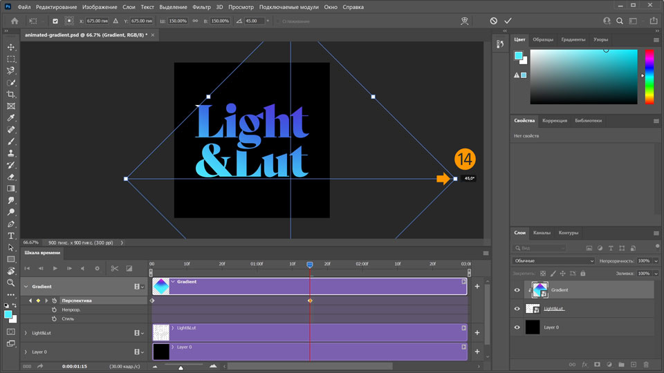 14. Теперь поместите курсор мыши рядом с градиентом. Когда вместо стандартного курсора отобразится курсор с двумя стрелками, поверните градиент примерно на 45 градусов и немного переместите вверх. Убедитесь, что надпись всегда полностью покрыта градиентом. Нажмите на Enter/Return, чтобы подтвердить преобразование.