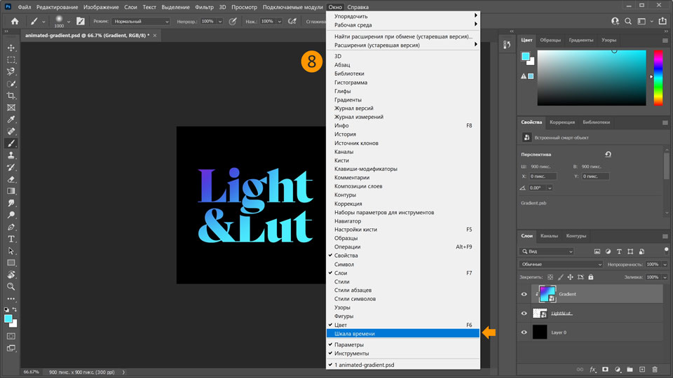 8. Откройте Окно шкалы времени, в котором можно создавать анимацию на шкале времени, для этого выберите Окно > Шкала времени.