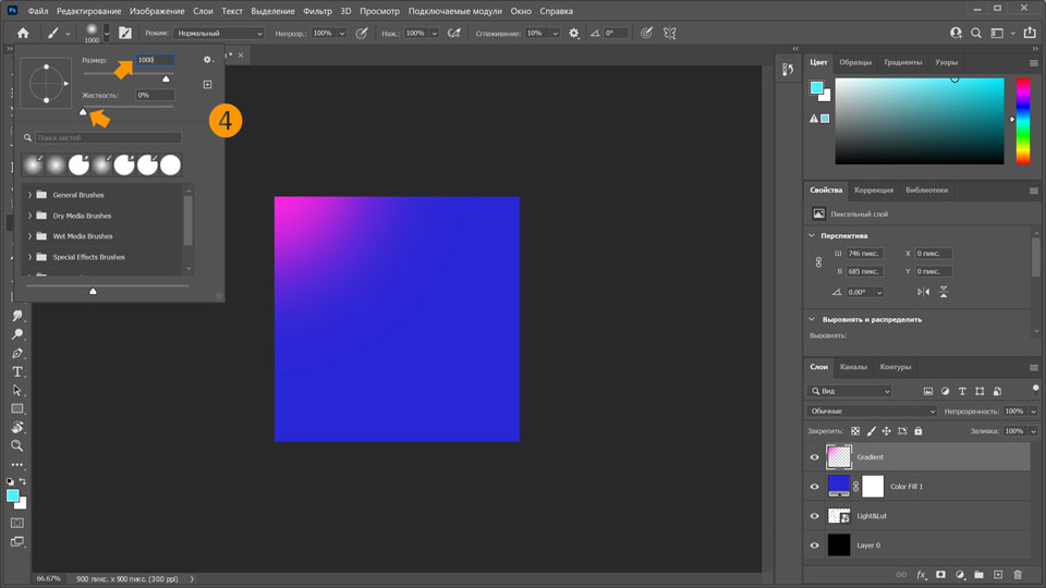 4. Нажмите на Заданные настройки кисти, чтобы настроить толщину кисти. Установите значение размера на 1000 пикселей. Убедитесь, что выбрана Мягкая кисть. Установите жесткость на 0%.
