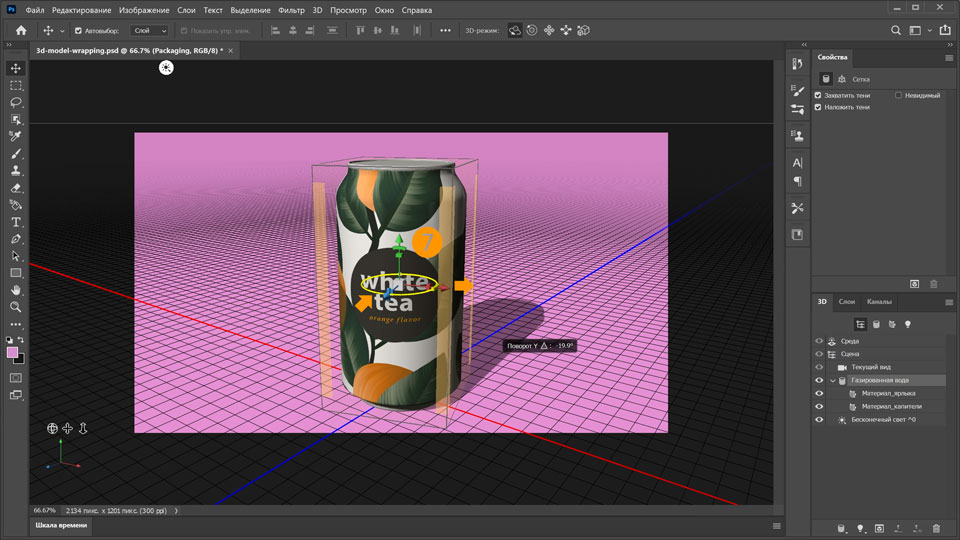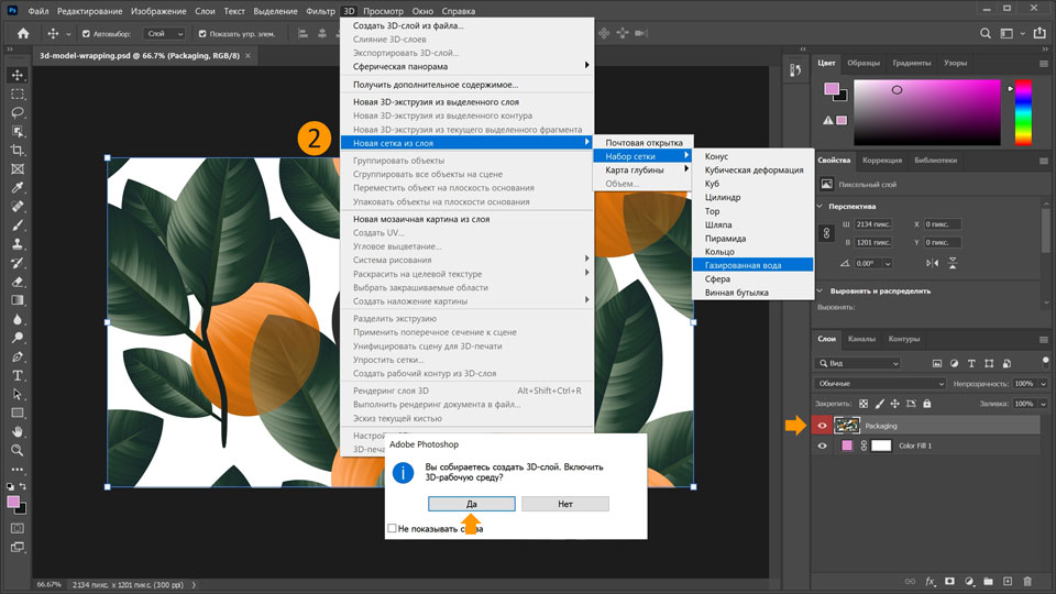 2. Выбрав слой под названием Packaging graphic, перейдите к 3D > Новая сетка из слоя > Стиль сетки > Газированная вода , чтобы разместить на 3D-упаковке изображение. Photoshop спросит, хотите ли вы переключиться в трехмерное рабочее пространство. Нажмите Да, чтобы продолжить.