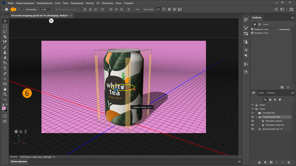 6. Теперь поверните банку так, чтобы этикетка была обращена на зрителя. Для этого нажмите на банку, чтобы отобразить ось 3D. Наведите курсор на красный маркер оси y, так чтобы отобразился желтый круг.