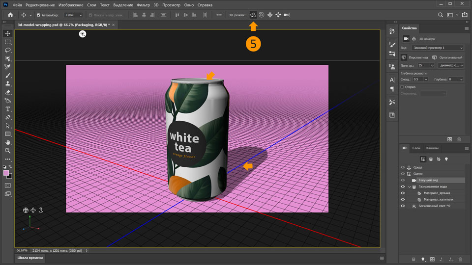 5. Выберите Переместить 3D-камеру по дуге на верхней панели. Курсор примет вид миниатюрной орбиты, с помощью которой вы сможете вращать трехмерную модель. Теперь можно вращать экран в разных направлениях, чтобы изменить вид банки в пространстве. Выберите вид, при котором частично видны верхняя часть банки и отбрасываемая ею тень.