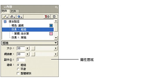 每個效果都有不同的屬性,在選取效果時會顯示在「物件」面板底部的屬性區域中。