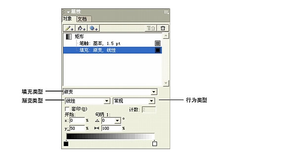 填充是对象的属性。当您使用“添加填充”按钮给对象添加新填充时,所创建的填充是基本的纯色填充。您可以使用“对象”面板中的填充类型弹出菜单选择渐变类型(和其它填充类型)。