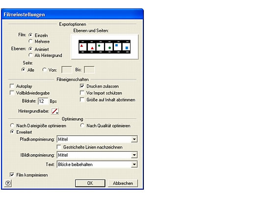 Das Dialogfeld Filmeinstellungen wird angezeigt. �ber dieses Dialogfeld k�nnen Sie festlegen, wie Ebenen und Seiten in FreeHand in Flash-Filme konvertiert werden.