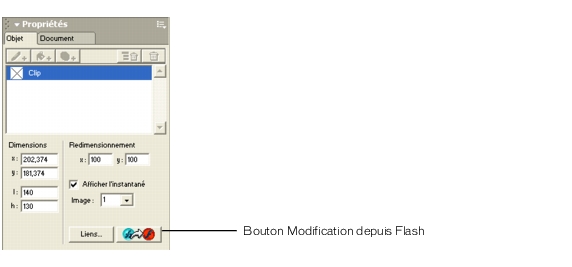 Pour modifier une animation Flash dans Flash MX, sélectionnez-la dans la fenêtre Document de FreeHand, puis cliquez sur le bouton Modification depuis Flash du panneau Objet. Vous pouvez ensuite accéder au document FLA Flash qui a été utilisé pour créer lanimation Flash importée et louvrir.