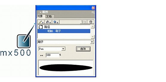 在“库”面板中双击“钢笔刷子”符号旁边的图标,然后在屏幕上出现的编辑窗口中选定该刷子顶端。 |