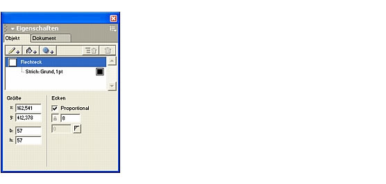 Im oberen Bereich des Bedienfelds Objekt wird die Eigenschaftenliste angezeigt, eine hierarchische Auflistung der Eigenschaften des ausgew�hlten Objekts. Zur Zeit ist das Rechteckobjekt ausgew�hlt, das nur �ber eine Eigenschaft, einen Strich, verf�gt. Die Attribute der ausgew�hlten Eigenschaft werden in der unteren H�lfte des Bedienfelds Objekt angezeigt. Der Inhalt des unteren Bereichs des Bedienfelds Objekt h�ngt von der in der Eigenschaftenliste ausgew�hlten Eigenschaft ab. |