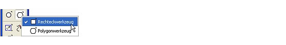 Wenn dieses Werkzeug nicht angezeigt wird, steht vielleicht das Polygonwerkzeug zur Verf�gung. Sollte dies der Fall sein, klicken Sie mit der Maustaste auf dem Polygonwerkzeug, und halten Sie sie gedr�ckt, um ein Werkzeug-Popupmen� anzuzeigen. W�hlen Sie daraus das Rechteckwerkzeug aus. Werkzeuge, die �ber ein Popupmen� verf�gen, weisen in ihrer unteren rechten Ecke einen kleinen Pfeil auf.