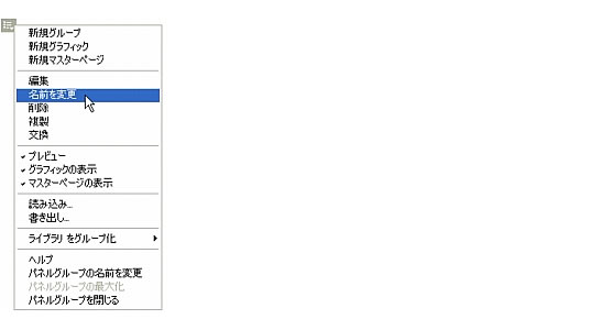 グラフィック-01 シンボルを選択し、ライブラリパネルのオプションポップアップメニューをクリックして、オプションメニューを表示します。[名前を変更] を選択します。